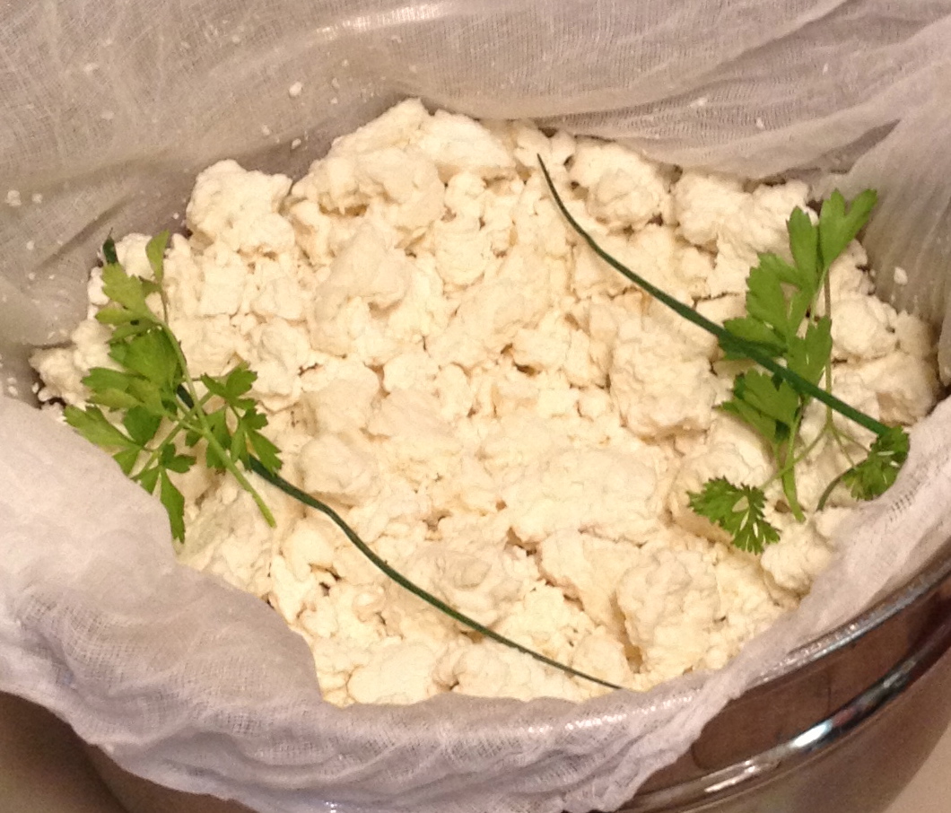 We began the curd making mid-morning. We heated the milk to about 100 degrees, added the calcium chloride and thermophilic culture and let it sit for 30 minutes. We then added the rennet, stirred for 30 seconds and let sit for another 30 minutes, at which time we had a white gelatinous curd substance instead of milk – very magical. We diced the up the curds in the pot and “cooked” them at a slightly higher heat – about 115 degrees for 45 minutes. We separated the curds and the whey using the cheesecloth, and then tied the cloth as tightly as possible, squeezing the curds. We set the cheese curd ball in a colander, put a one gallon milk container filled with water on top for a weight and “pressed” the curds for about three hours.