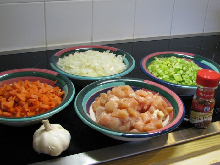 - Two skinless chicken breasts – cut into ½” cubes