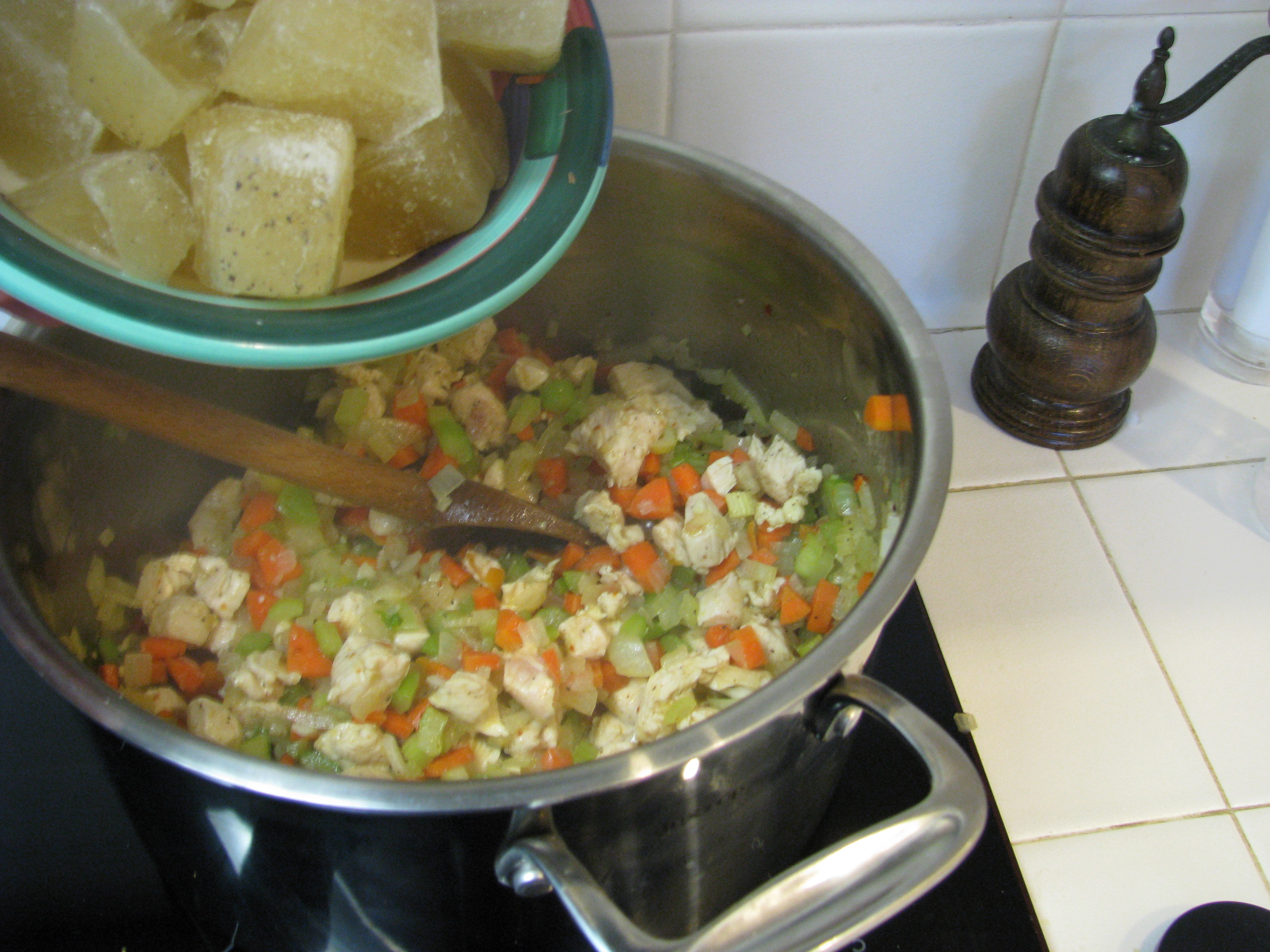 - Pat the chicken with paper towel until dry and add to the pot. Brown the chicken for about four minutes, stirring continually.