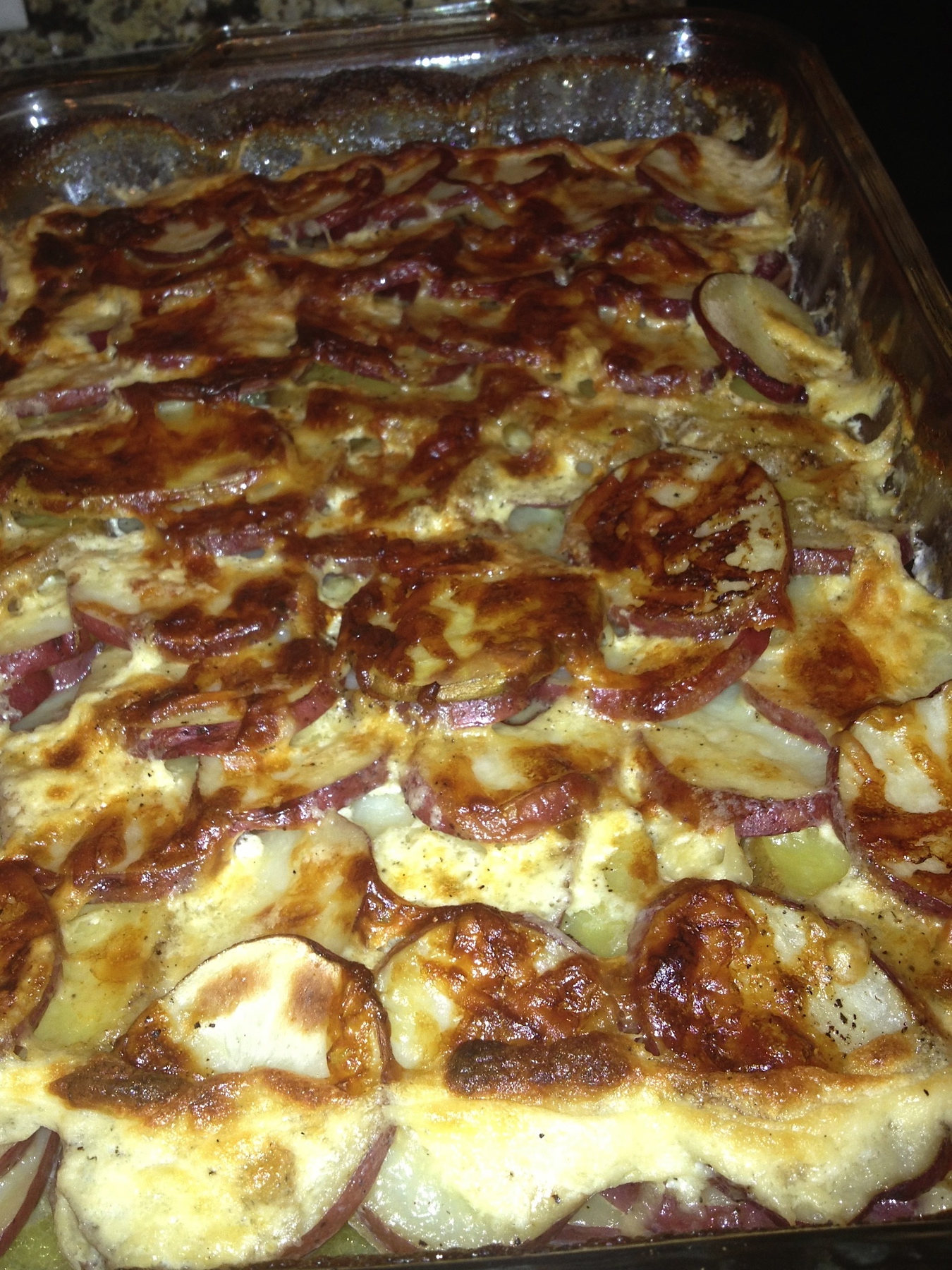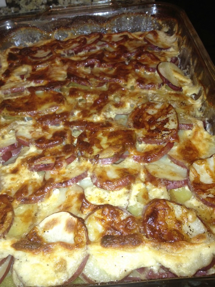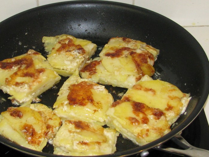 Forget hash browns, American fries or any other potato for breakfast. Take your leftover Gratin Dauphinois, cut them into squares and save in the refrigerator or freezer. When you feel like have the “big breakfast”, you just plop the Dauphinois squares into a skillet with a little olive oil and heat them up over medium heat – about 5 minutes on each side. If frozen, defrost in the microwave.