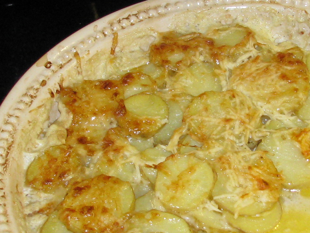 History: This dish originated in and got its name from the Dauphine district of southeastern France. This is a largely mountainous area and famous of skiing. Grenoble is largest city. This area is a producer of Emmental cheese (commonly called Swiss cheese), which is used in the recipe. The bubbles in this type of cheese are due to CO2 gas that is allowed to remain in the cheese during processing – in a sense an intended defect.