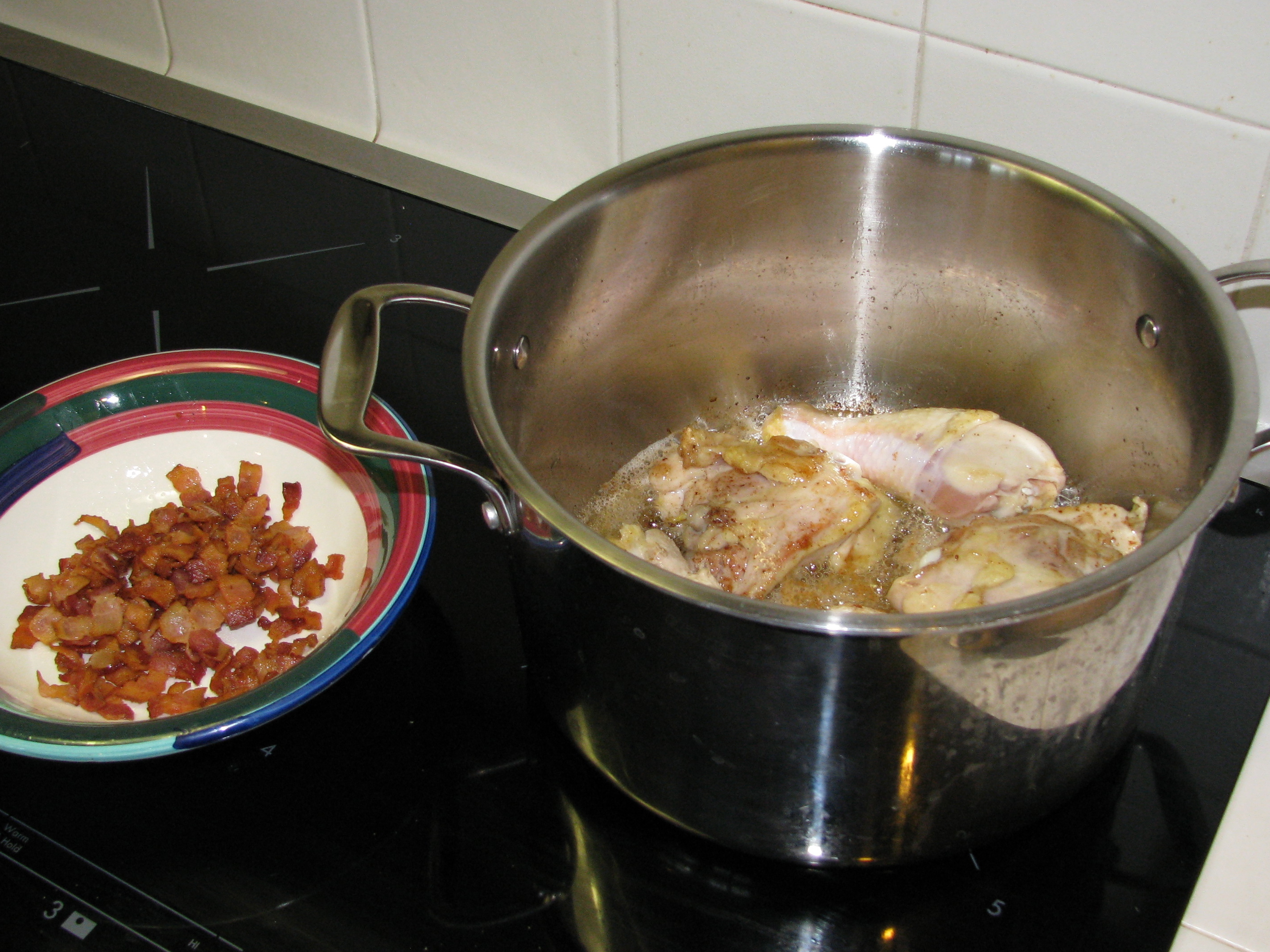 The preparation starts with a whole chicken(s), cut up into pieces.  You can either do the butchering yourself or you can always find a whole cut chicken at the supermarket.  The latter is the easiest choice.  You then dice and cook some bacon, and brown the chicken pieces in the bacon fat, to which you have, in true French fashion, added a little butter for flavor.