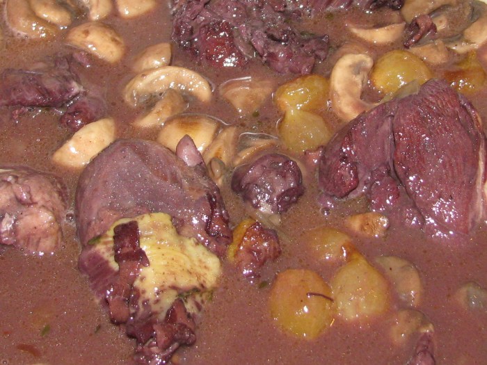 Once the chicken is browned, you cook it in a bottle of rich red wine and some chicken broth.   When the chicken is ready, you remove and set aside while you reduce the sauce by about one-half.  This red wine reduction is the key to the dish.  When this process is complete, you return the chicken to the pot, add sautéed mushrooms and roasted pearl onions and serve.