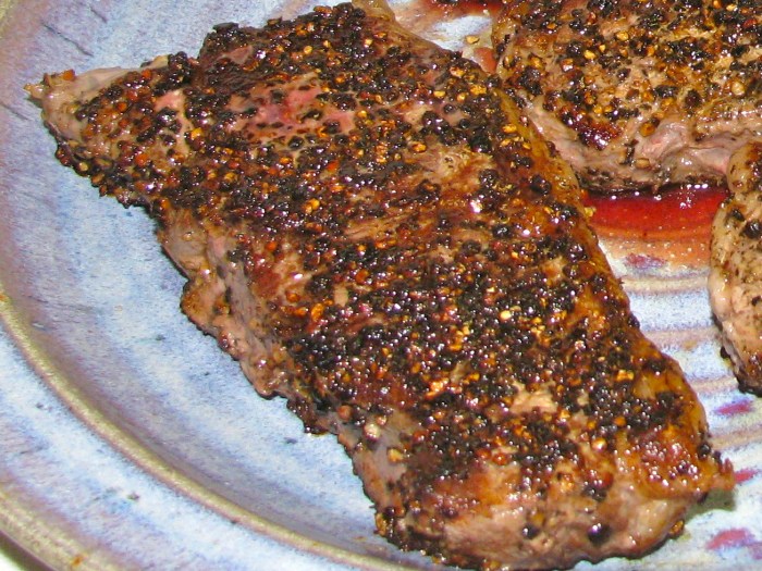 Don’t confuse the French pepper steaks with the imposters, which are often served with strange cuts of beef that have been sliced, diced, stewed or fried and dumped over rice. The French classic only uses a good tenderloin, either N.Y. strip or filet mignon style. You can also forget the outdoor grill – this dish is done on the stovetop.