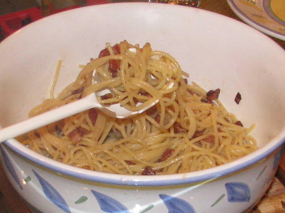 You will experience a fantastic warm glow after finishing this great dish and your mind will wander back to those GI’s and young Italian girls who invented this classic. I see them after the meal chatting happily with a glass of wine trying to teach each other words from their language. The wife of the coal miner, the “carbonara”, must be the grandmother of one of the young girls and did the cooking. She is smiling and cleaning up.