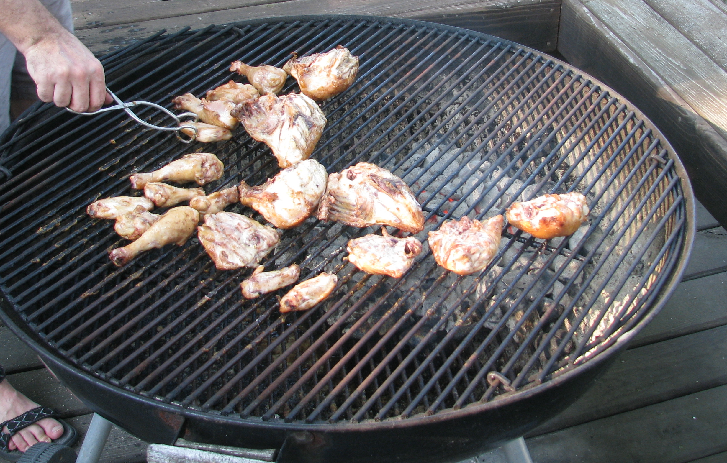 - Prepare the grill for indirect cooking and put the chicken pieces on the grill away from the fire (see discussion above).