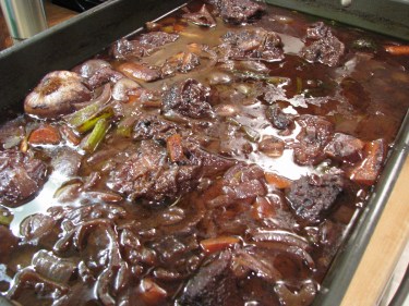 7. Add all of the rest of the ingredients, except the butter, and the remaining wine to the roasting pan.  The ribs should be submerged.  If not, add a little water.  It will look like this: