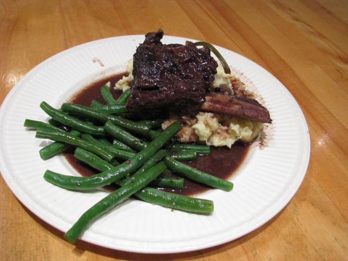 So, we are at a dinner party and my friend Bob asks me what is my favorite thing before dinner.  I think he was talking about drinks, but my mind wandered.  Since it was mixed company, I couldn’t really discuss my most favorite thing before dinner.  As I broke out of my reverie, pleasant as it was, I recovered quickly and responded that I really appreciate some quiet time before dinner to enjoy a good glass of wine (or vodka) without having a lot of last minute cooking chores.  I mean, sometimes it is fun to have a crowd in the kitchen all working on a meal, but it is also pleasant to have a dinner party where you can easily spend time with your guests.  Braised beef short ribs are a perfect solution.  In terms of an easy dinner party, this dish is similar to Beef Bourguignon, Coq Au Vin or Jambalaya – it can go from oven to the table easily and quickly.