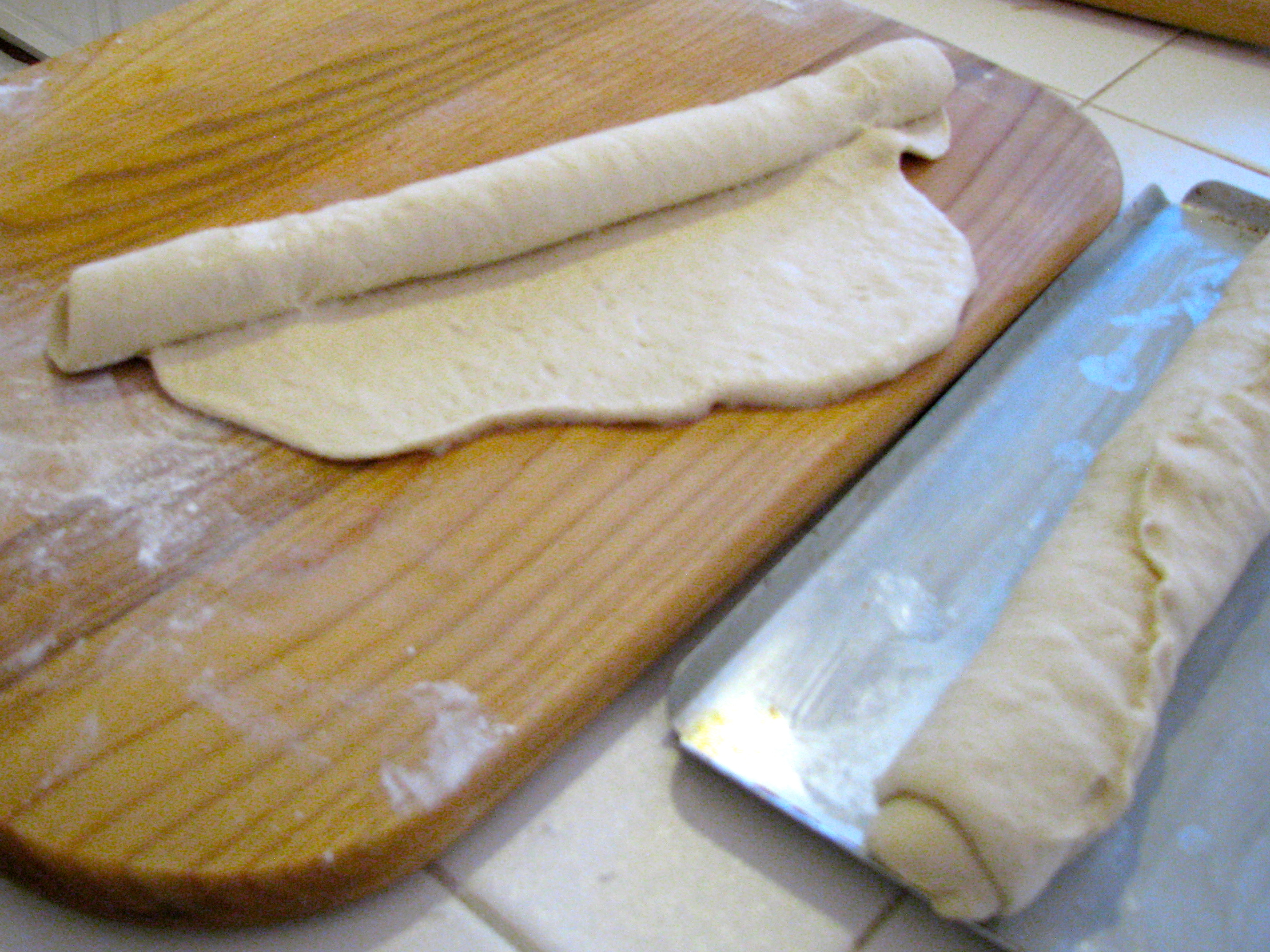 9. Starting on one side, roll up the dough and pinch the end onto the main body of the loaf.  Place the loaves on the greased baking pan, cover lightly with a kitchen towel and let rise for one hour.