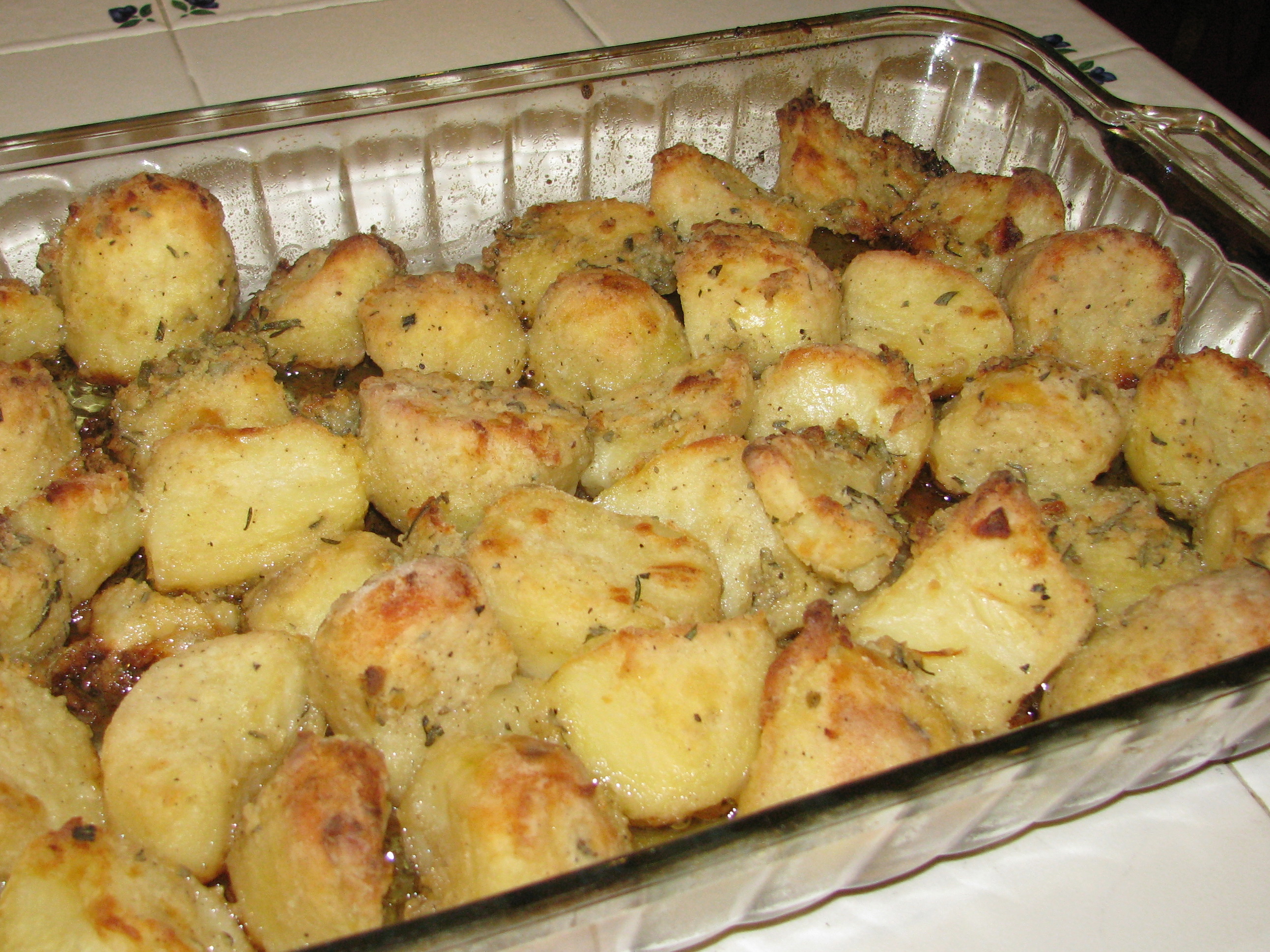 The real secret to this dish is a very clever technique that allows you to roast russet or high starch content potatoes.  Usually, the only way you roast a russet potato is with the skin on.  The result is the standard baked potato with the soft, mealy interior, which we slather with butter and sour cream.  (Russets also make the best French fries – the deep frying creates a crusty outer shell while the inside stays soft – and they are the usual choice for mashed potatoes because they become very soft when boiled.)