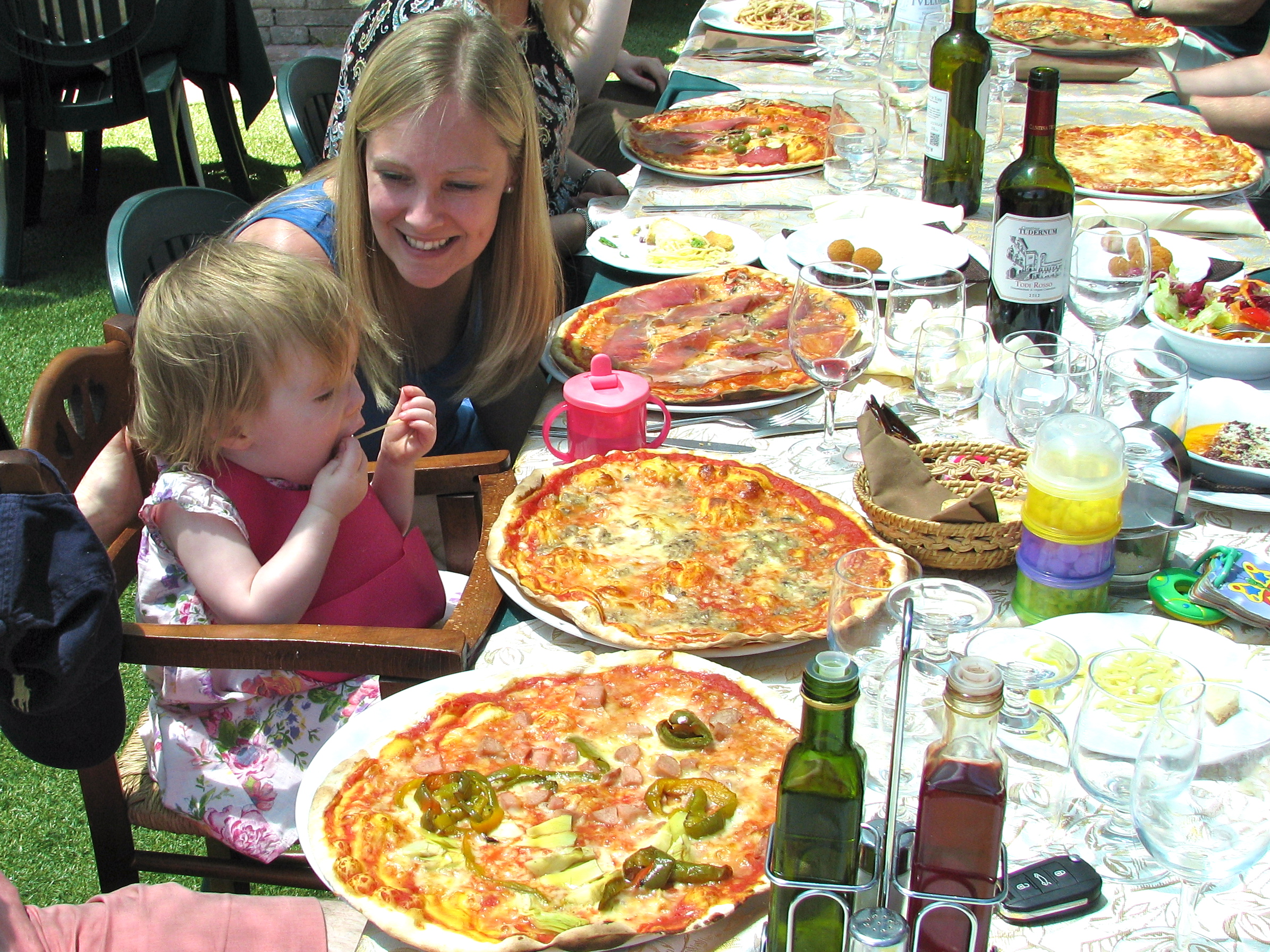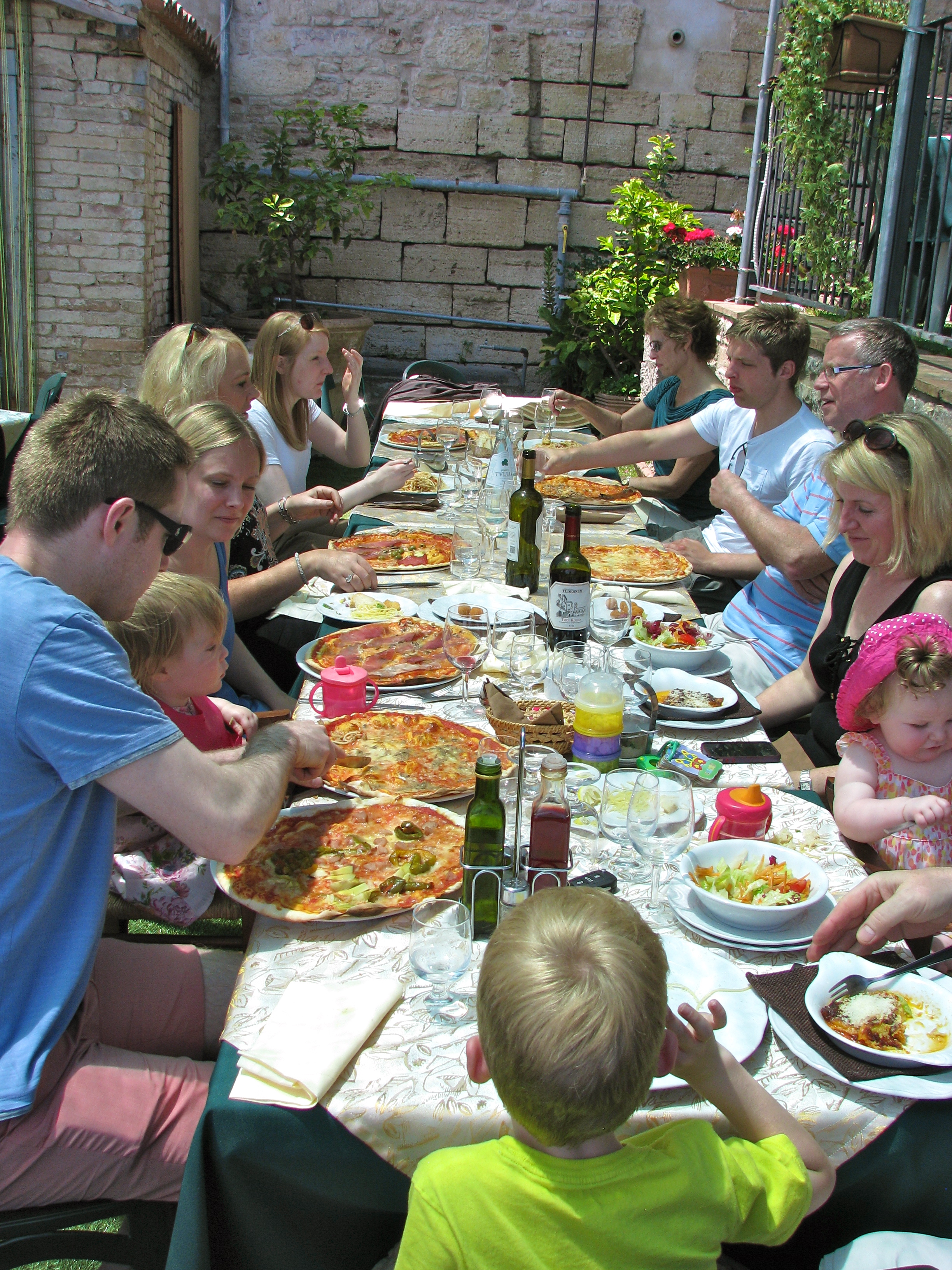 One of the prettiest is Todi, just off the A45 expressway between Terni and Perugia. We were with a group of friends and we were looking two things – the famous Umbrian thin crust pizza and a setting which would allow us to appreciate the wonderful scenery. Ristorante Pizzeria Cavour filled the bill. We had heard about this spot from other friends. Although the street entrance is humble and unimposing, the outdoor terraces on the back of the restaurant literally hang over the edge of the hilltop and look far into the valley. More importantly, the pizzas were wonderful as you should be able to appreciate from the photos.