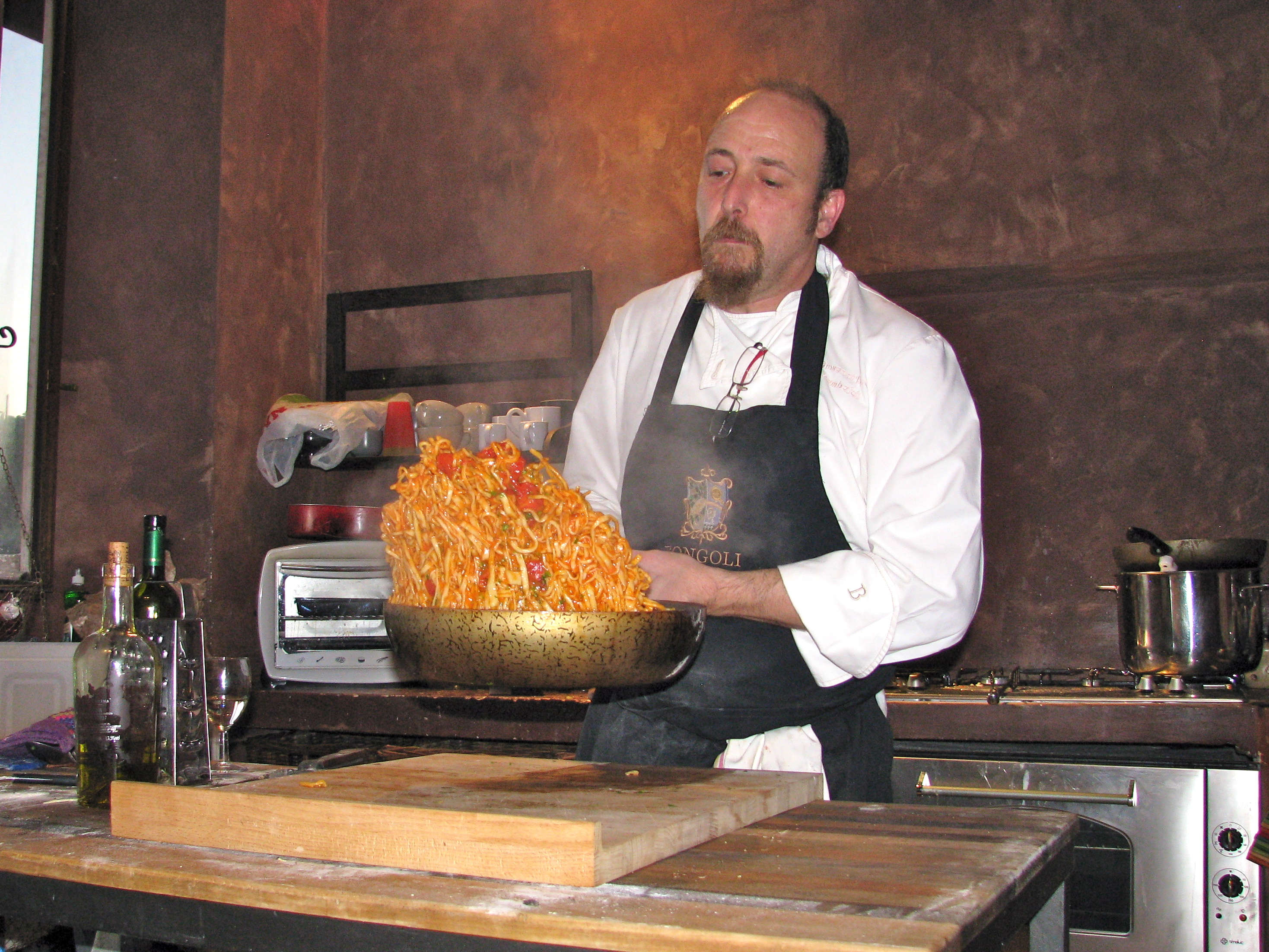 While preparing the pasta, Jean Luca was supervising the chicken cacciatore, which was browned first in olive oil and then braised on the stove for over 30 minutes in a special organic white wine (which was cloudy and very vinegary). The only other thing added was fresh herbs that the chef had cut before coming – wild fennel, rosemary and basil. The result was strongly herbed chicken (thighs and legs only) with a thick coating of white wine reduction sauce. It was great and there were no tomatoes, peppers, oregano and all of the other things you ususally find in this dish. I think I like the Umbrian version better.