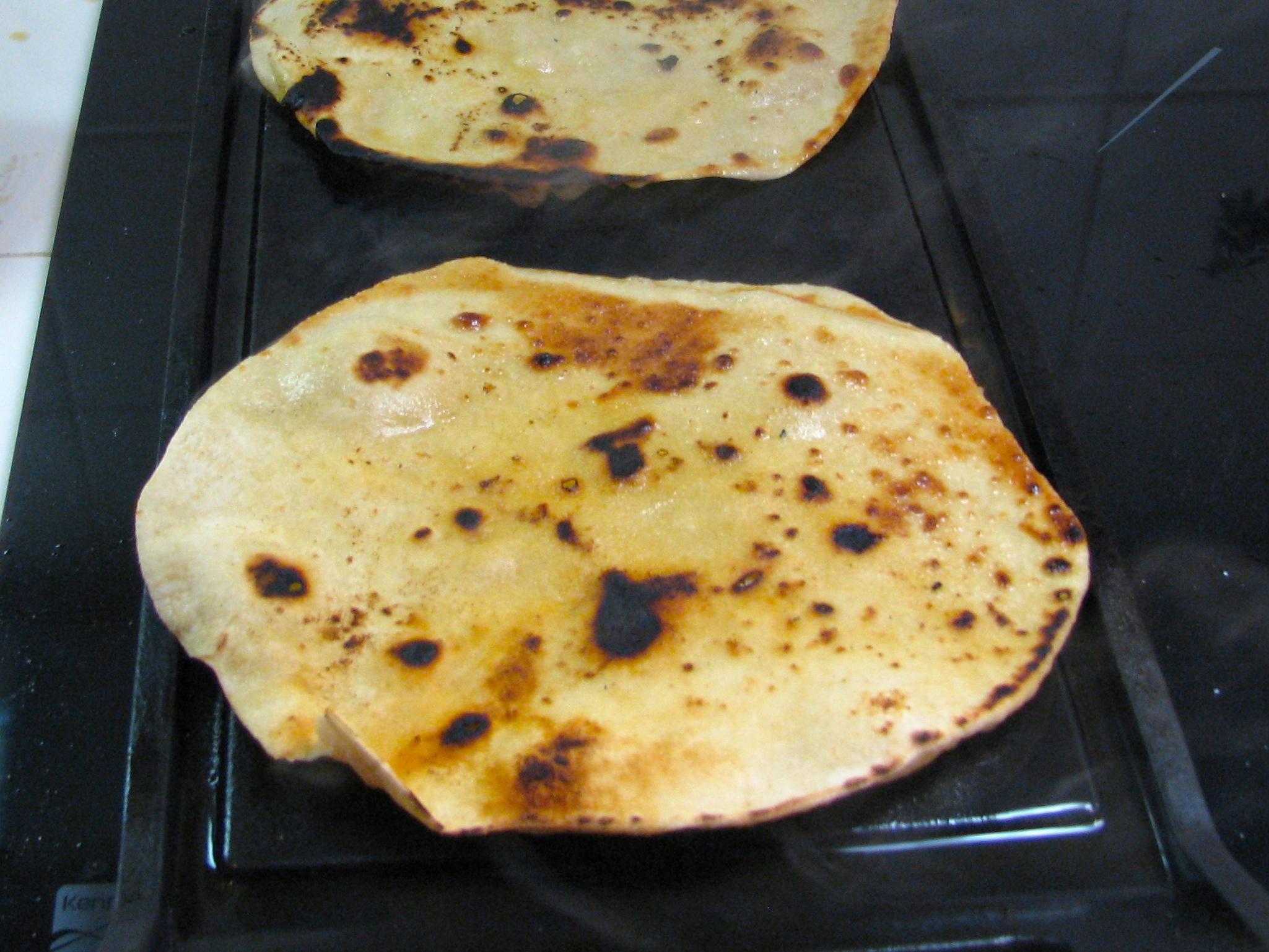 - If you have a griddle on the top of your stove, it will come in handy for making roti because you can do two or three at a time. If not, use a 12″ frying pan. Turn heat to medium-high, but reduce if flatbreads start to burn. Roll out each ball into an oval about 10′-12′ in diameter, brush olive oil on both sides and put on the grill or into the frying pan. Cook 1-2 minutes on each side until golden brown. You will see the baking powder go into action.
