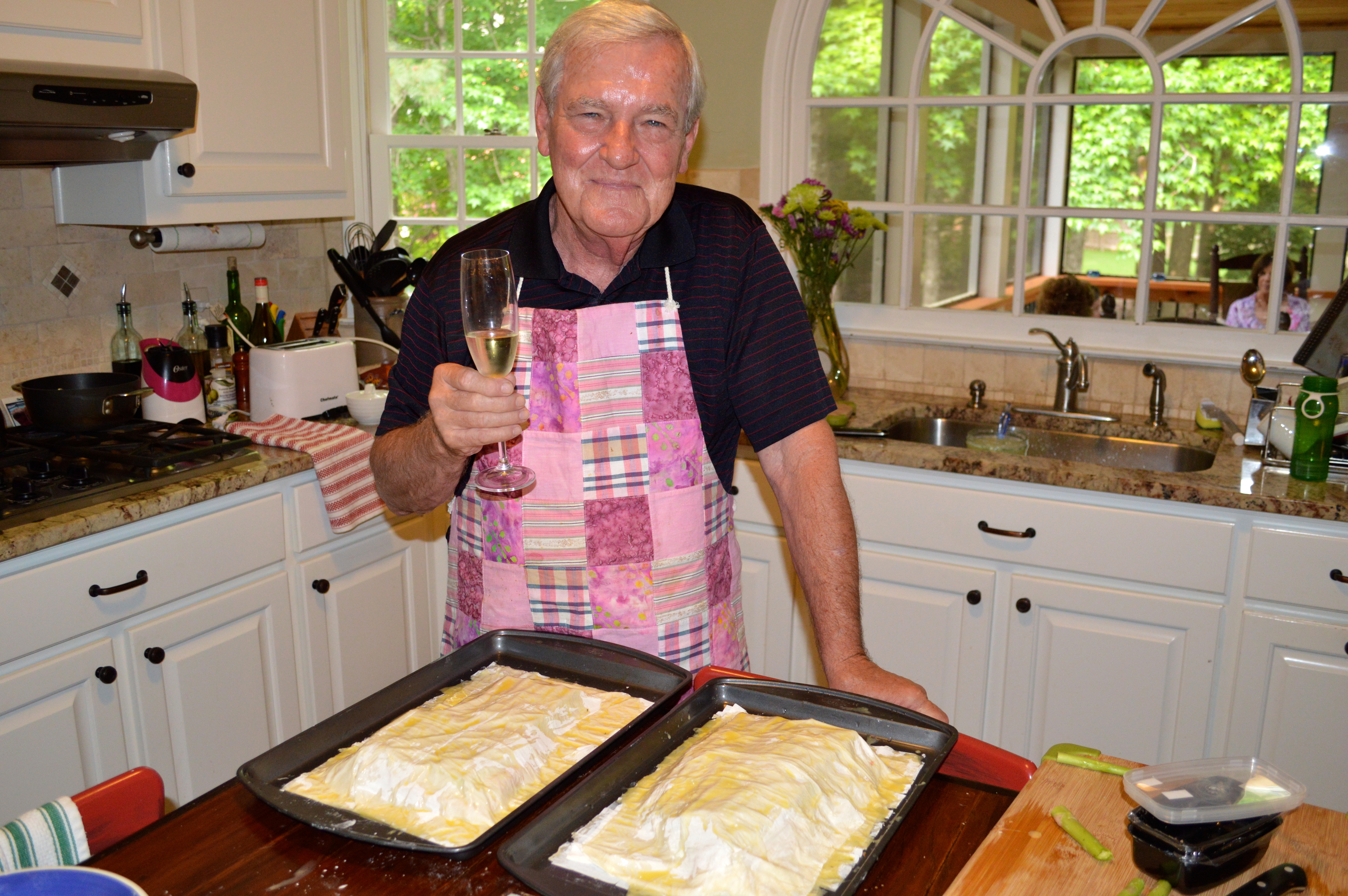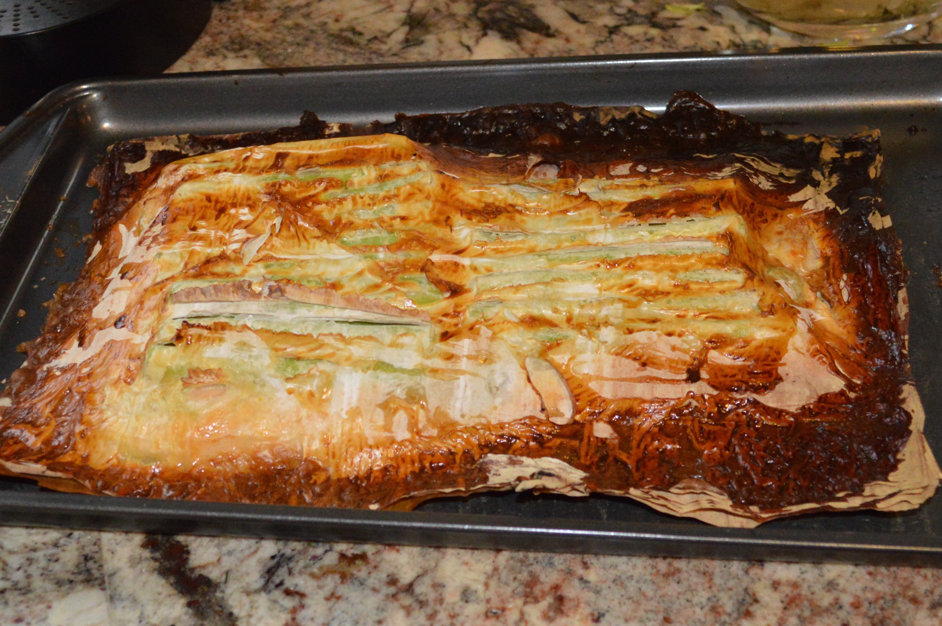Once in the kitchen, he turned on the oven to 375 degrees. We had purchased a three pound salmon filet at Costco, which we cut in half. My job was to pat the filets dry with paper towel and lightly season with salt and pepper. I got out the phyllo dough (sometimes called “puff pastry” and available in the freezer section of any good supermarket), and put three sheets on top of each of two cookie sheets. I had been instructed to carefully moisten the cookie sheets with water before laying on the phyllo dough.