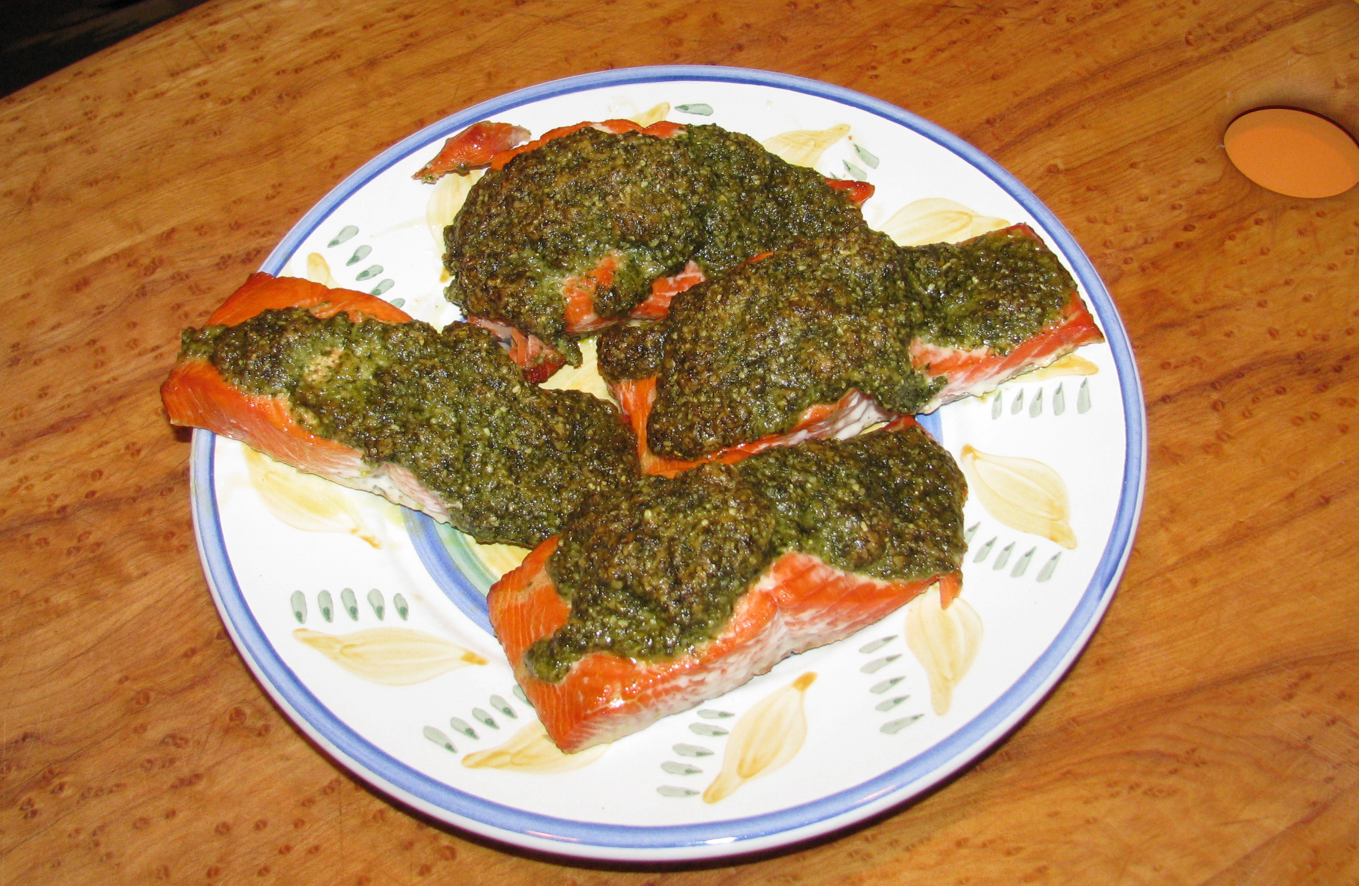 • Pesto and Salmon: You can go back to our post Salmon and Pesto for some interesting cooking techniques and information about salmon. However, the idea is very simple – no matter how you cook salmon, spread pesto on it. You can put it on the fish while cooking or warm the pesto and spoon over at the table.