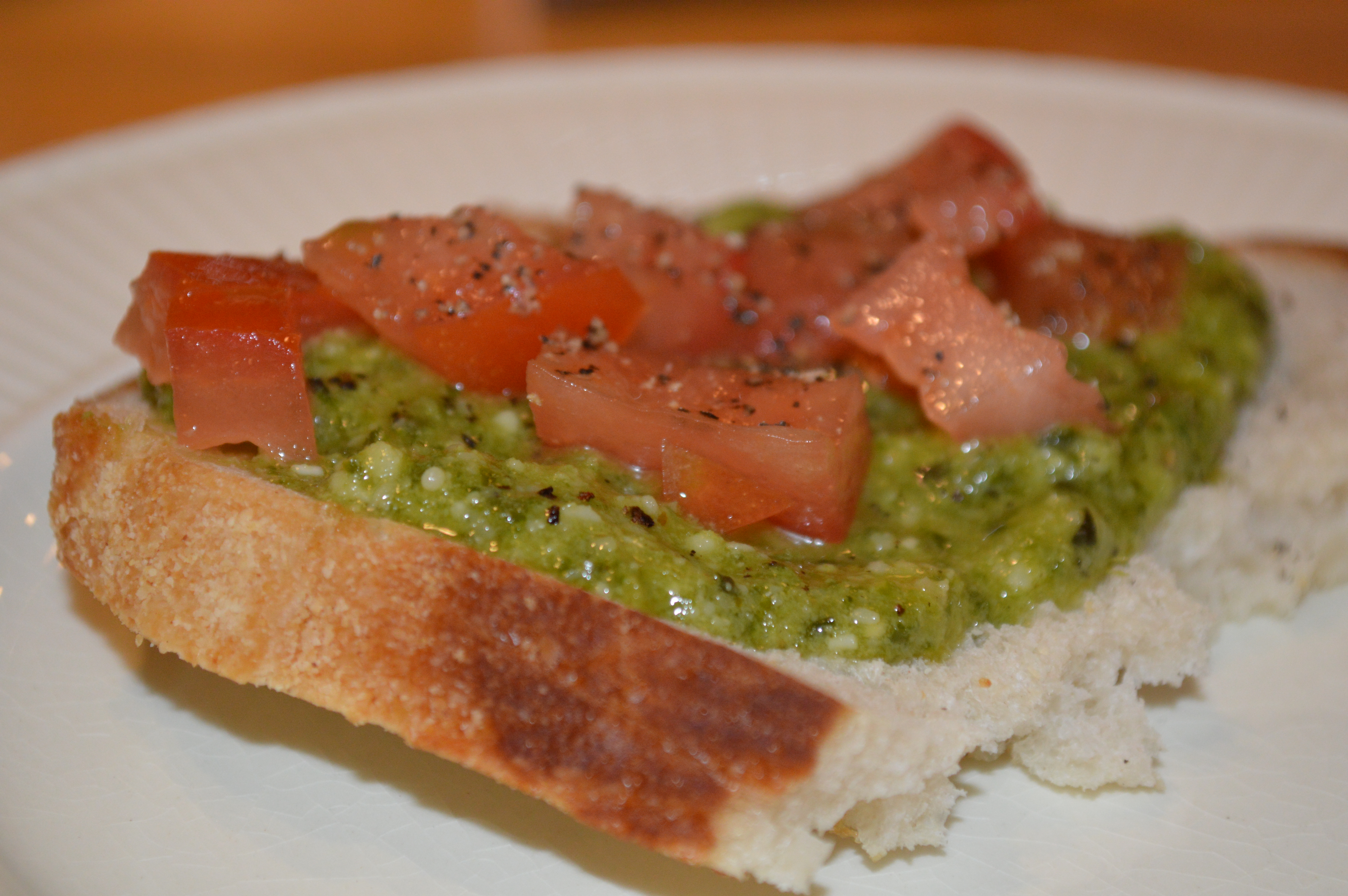 • Pesto and Tomato Sandwich: This is my grandson Eli’s invention. Take a piece of toast and spread pesto on top, scatter diced tomatoes on top, add a little salt and pepper and eat open-faced. This really works well with real summer tomatoes.