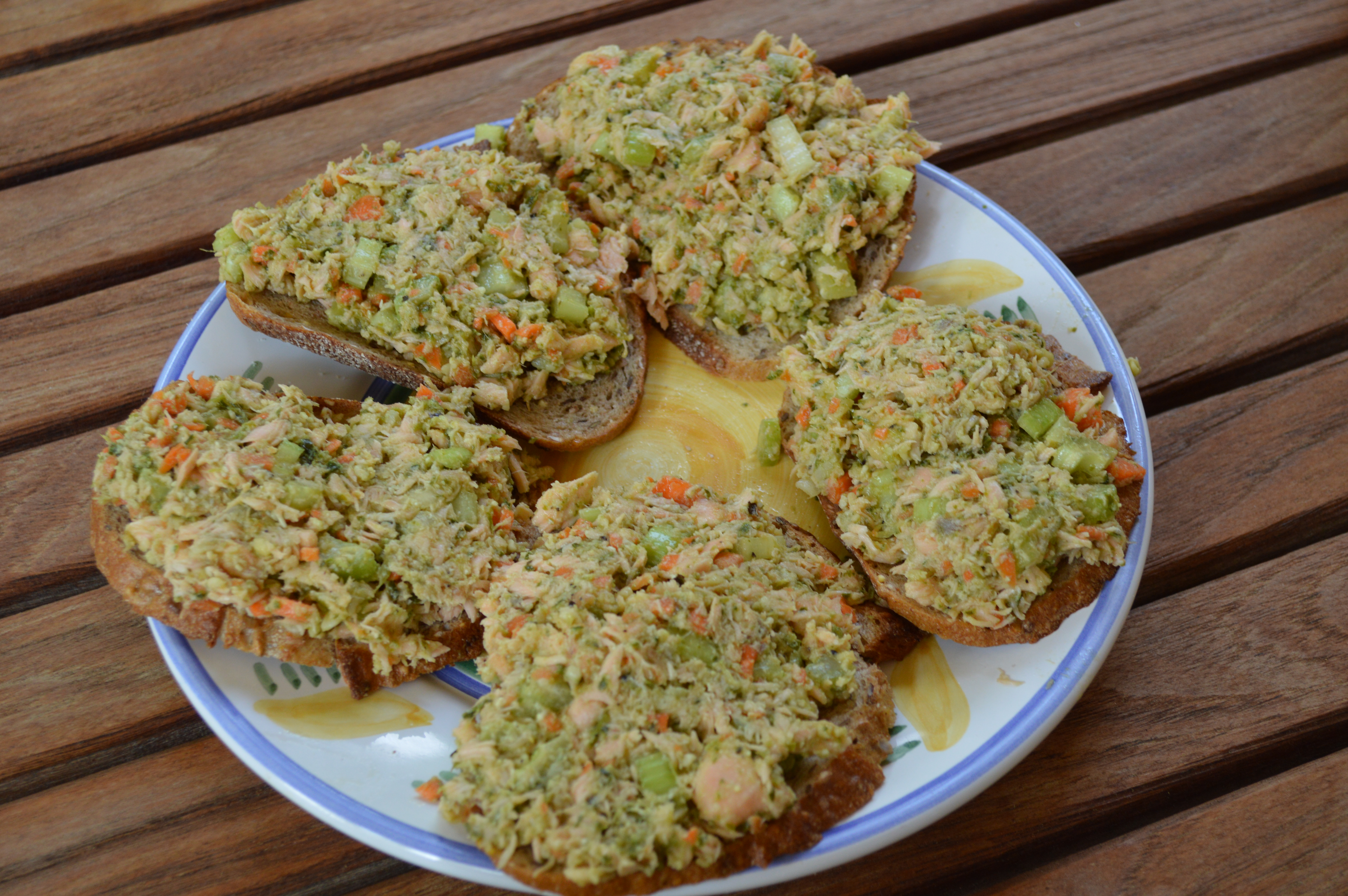 • Salmon Salad with Pesto on Toast: I made an al fresco lunch for family and friends using some leftover Scottish salmon from the night before. I chopped celery and carrot very fine, added the salmon and three spoonfuls of pesto. I mixed everything together and served on toasted whole wheat bread. Served with an arugula salad with melon on the side, it was a winner.