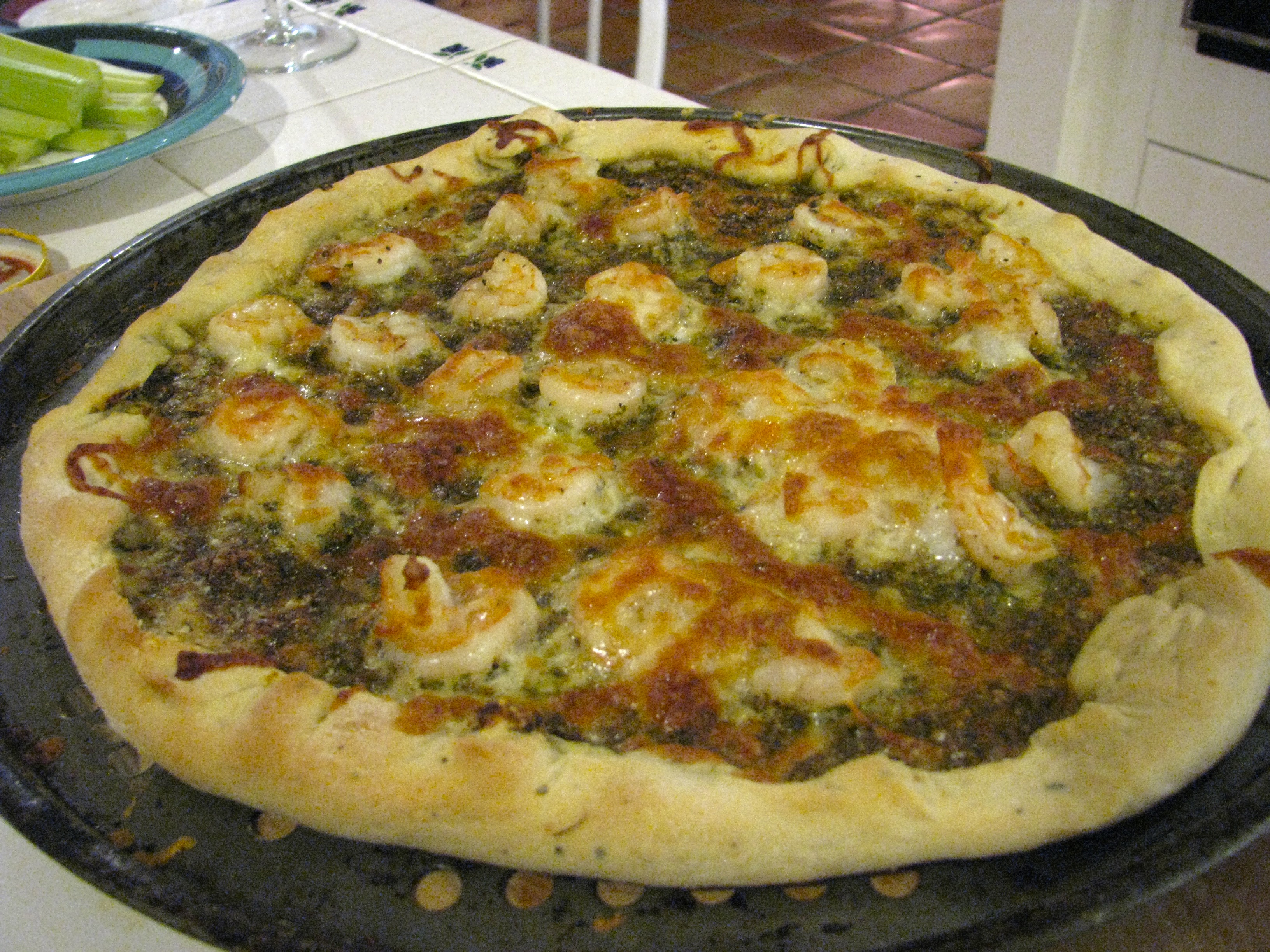 • Pesto pizza with shrimp: Try to get small, uncooked shrimp. Peel them and make sure you dry them thoroughly with paper towel. Spread on top of the pesto sauce, add some red pepper flakes and a little mozzarella. Tasty!
