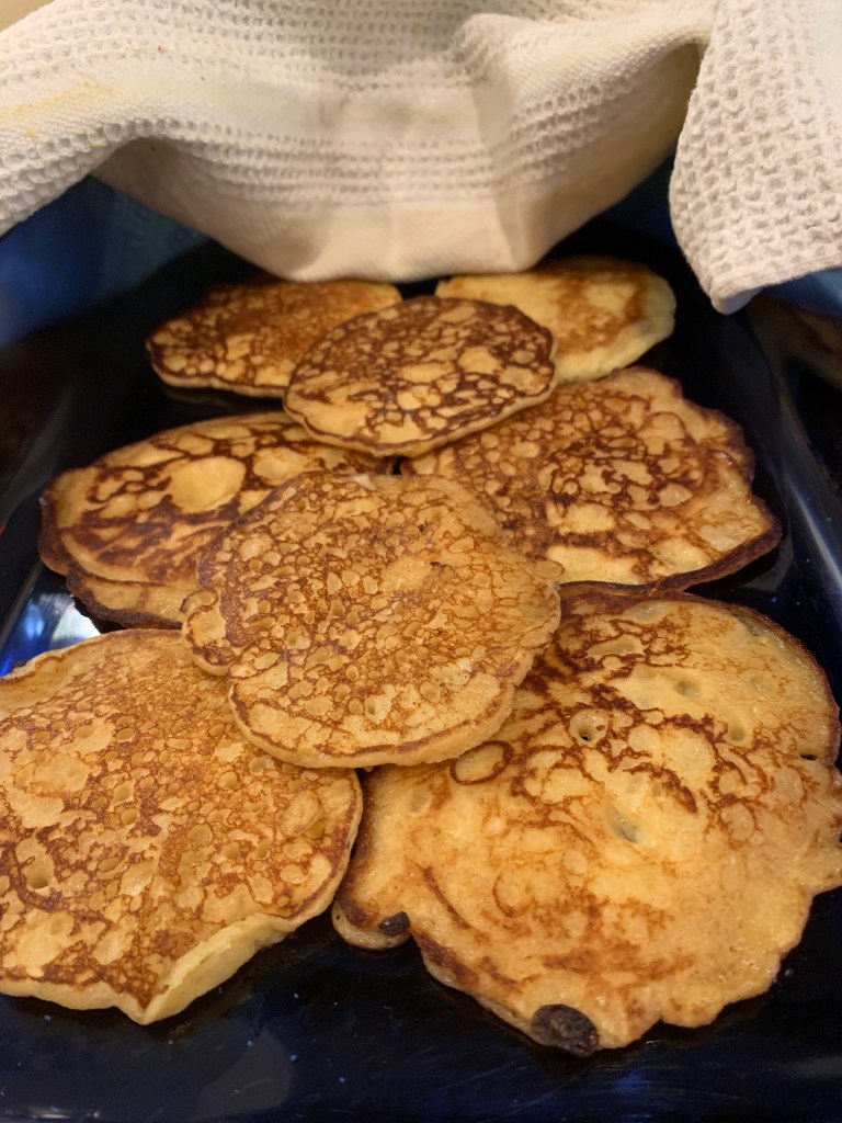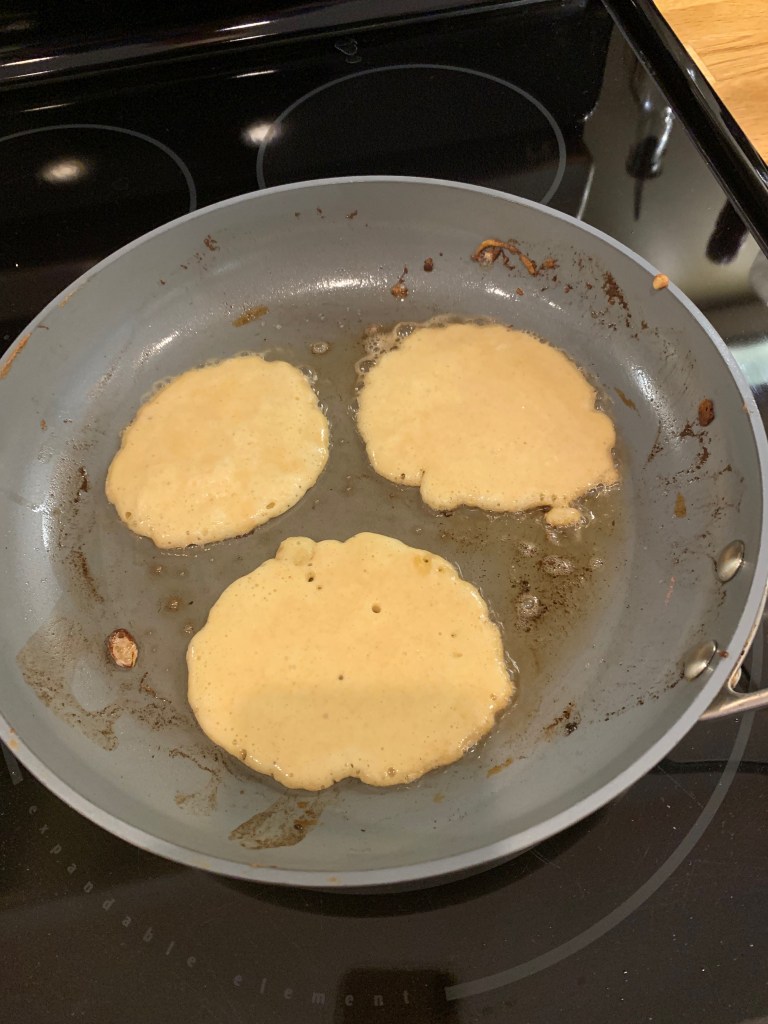 - Add a pat of butter to a large frying pan over medium-low heat. Add two tablespoons of batter for each of the blini. Flip when you see browned edges and bubbles on the top. Add additional pats of butter as needed.