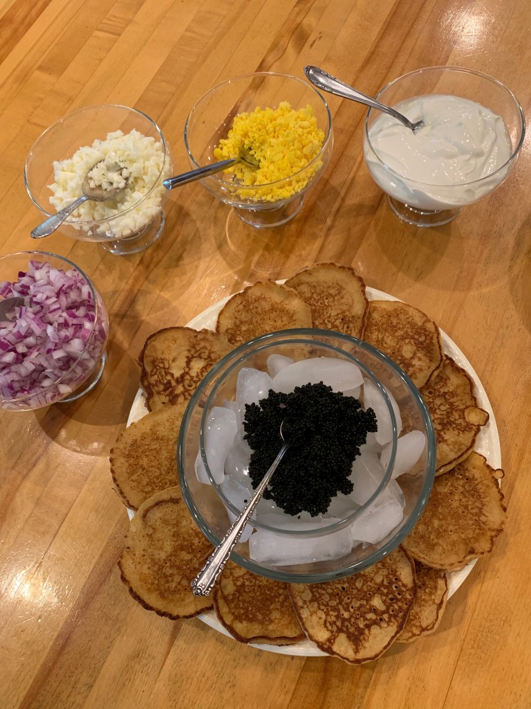The only issue with the accompaniments is hardware. You need to find some dainty bowls and small spoons for the onion, eggs and caviar. It is best to set the caviar bowl into a larger bowl which has ice to keep it chilled. (There are caviar bowls you can buy on Amazon) The vodka and champagne also need ice buckets. Improvise as needed.