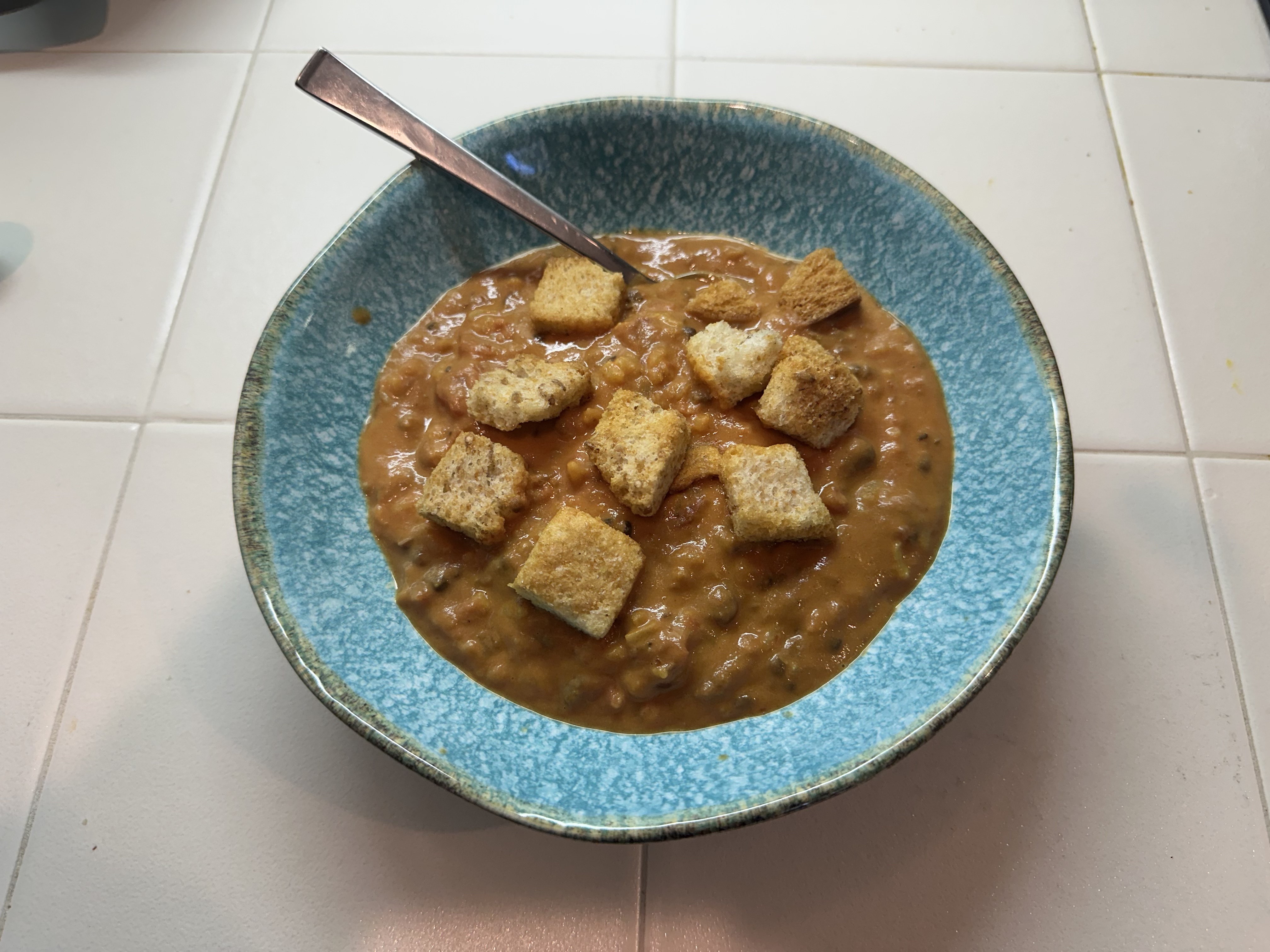 - Heat until nice and hot. Serve in soup bowls and top with croutons. Put extra croutons on the table.