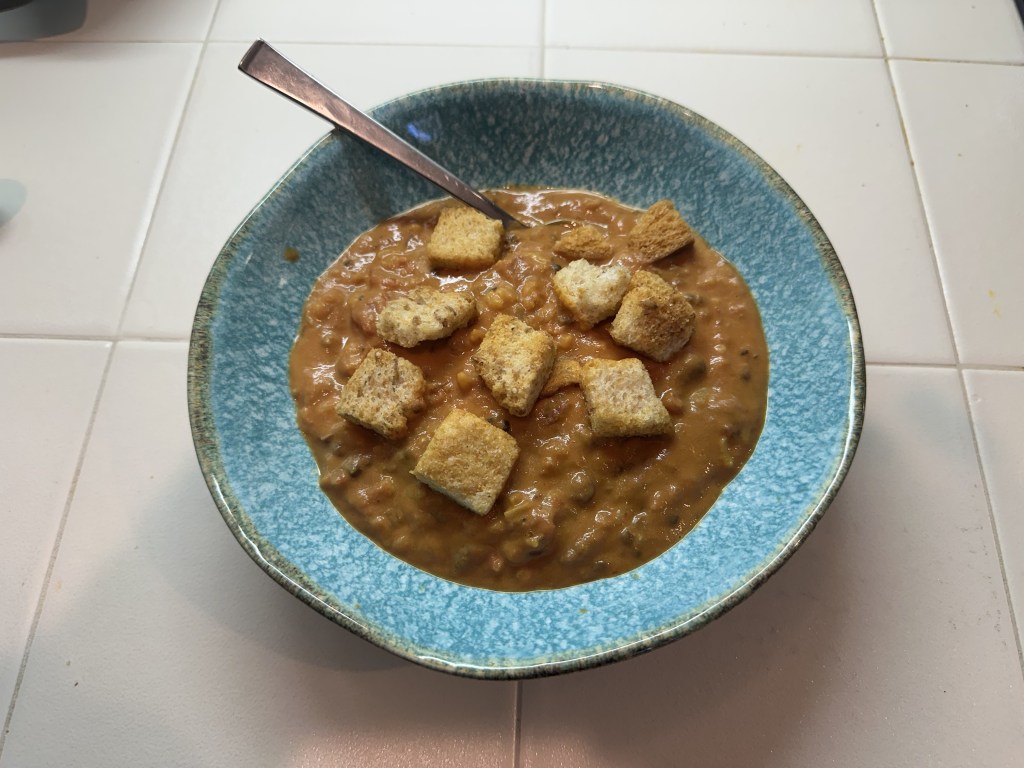 This is a dish that has two main products that you can buy from Costco. It is a 30-minute meal that will wow the troops. It is best served in a soup bowl. It already has 11 grams of protein per serving, but add some grilled chicken slices and you have a major league healthy meal. Skip the croutons if you are avoiding carbs, but you will be missing a taste treat! The recipe produces extra croutons; put them on the table and watch them dissappear. You can also buy the croutons at the store, but I encourage you to make your own. It is SO easy. Clearly, croutons is a “fusion” choice. The pure Indian choice would be naan or papadam.